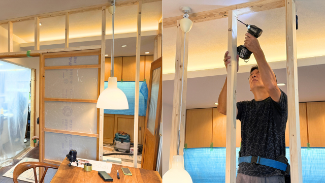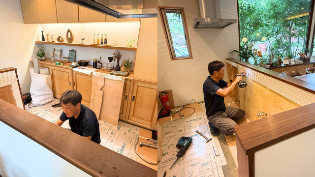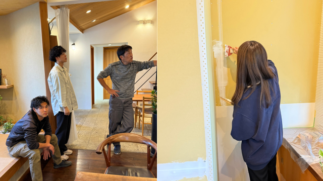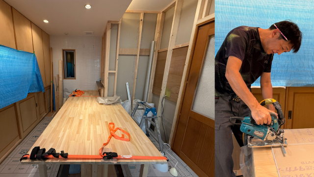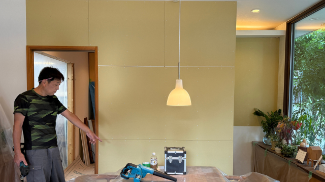 数日後、作業の進捗が気になって見に行ってみると、西川大工と袖野監督が石膏ボードの隙間を埋める作業をしていました。