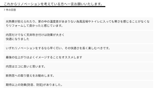 今回ご回答いただいたお客様に、「これからリノベーションを考えている方へ一言」コメントをお願いしました。皆様に向けて、断熱体感以外に施工中のアドバイスも頂戴していますので、ぜひお役立てください。